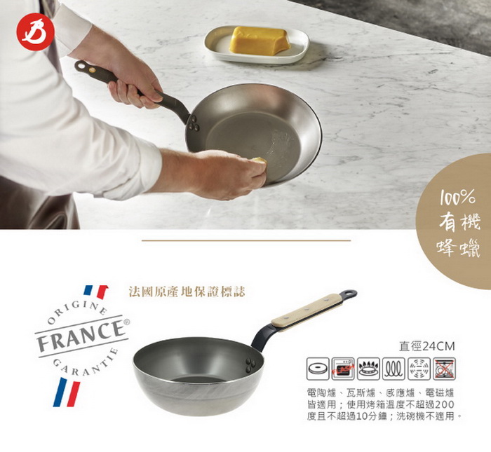- 主商品:de Buyer 畢耶 原礦木柄蜂蠟系列 傳統單柄深煎炒鍋24cm/鐵鍋 鐵鍋一只;原廠紙袋包裝