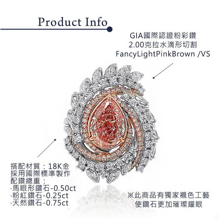 - 主商品:CTJ 漣漪GIA2克拉18K水滴粉紅彩鑽戒(FancyLightPinkBrown)