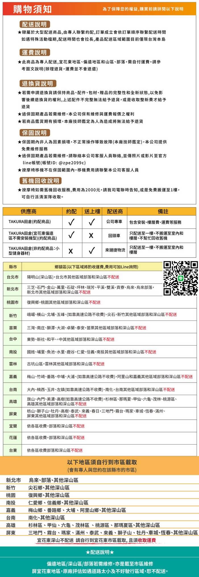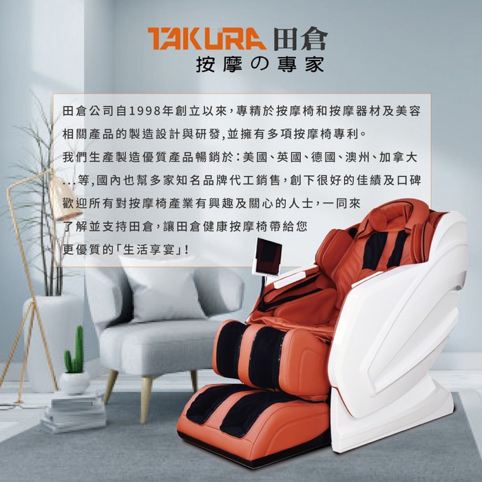 - 主商品:TAKURA田倉 極致摩力時尚按摩椅(型號:9730)×1