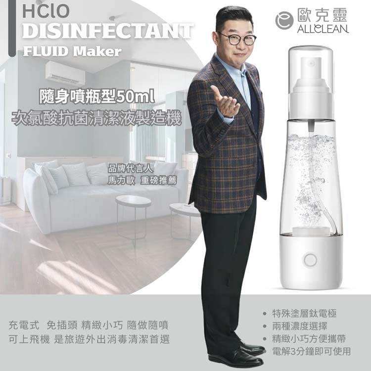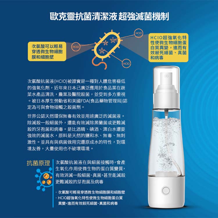 - 主商品尺寸/規格/重量:商品品名:歐克靈[隨身型] 抗菌清潔液製造機 產品編號:P-CLN01 輸入電源:DC 5V/2A 額定功率:3W 容量:50ml 工作模式:3min 尺寸重量:43 x 162 mm
