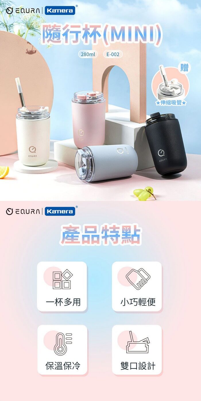 - 主商品尺寸/規格/重量/密度:產品名稱:隨行杯(MINI) 產品型號:E-002 產品材質:杯身材質-內膽SUS316不鏽鋼 外膽SUS304不鏽鋼 杯蓋材質-食品級PCTG 翻蓋材質-食品級PP 防水圈材質-食品級矽膠 產品容量:280ml 杯口內徑:約68mm 產品顏色:暖白、素黑、薄粉、薄藍 產品尺寸:約76×76×125mm 包裝尺寸:約78×78×126mm 產品淨重:約192g 產品毛重:約234g 包裝內容:隨行杯×1、配套吸管×1、說明書×1 製造產地:中國 保固:台灣代理商保固180天(非人為因素之損壞),個人衛生用品,一經拆封使用無法換貨。 備註:此賣場不含主機相關展示商品