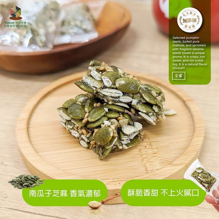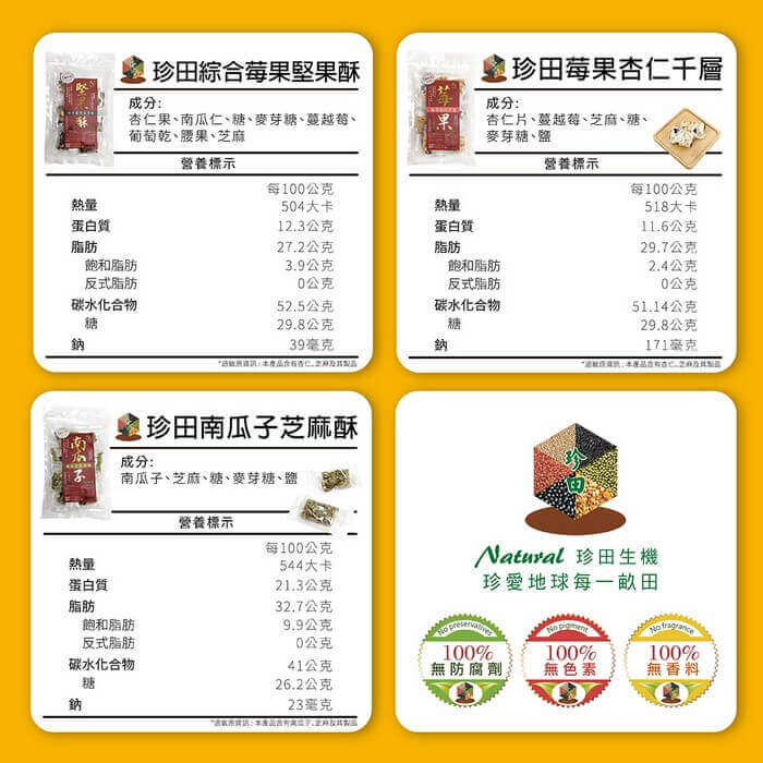 - 主商品:珍田堅果酥(南瓜子酥*2+莓果杏仁千層*2+綜合莓果堅果酥),6入組