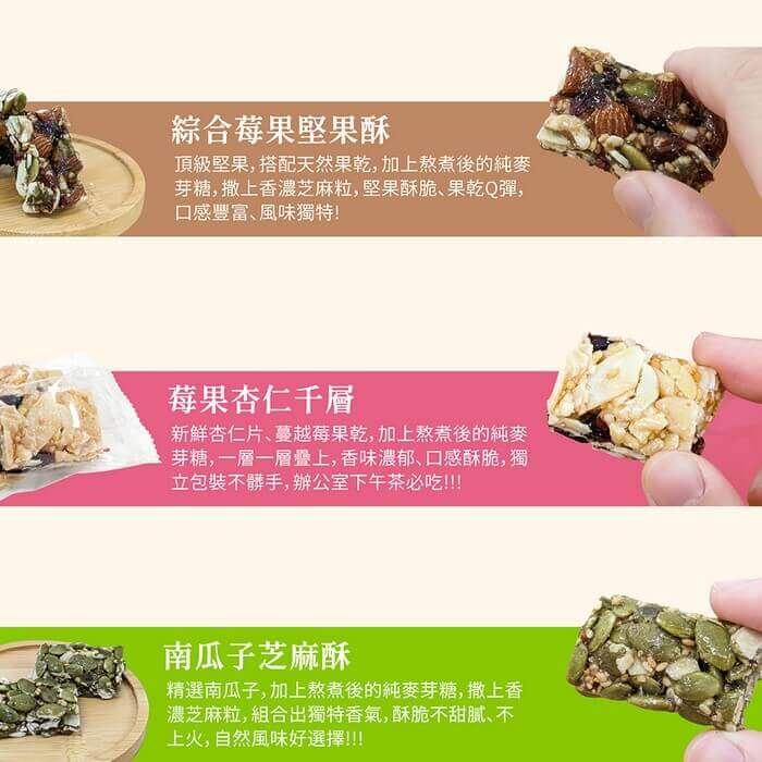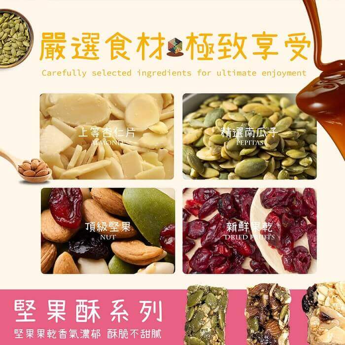 - 材質/食材:南瓜子酥:南瓜子、芝麻、糖、麥芽糖、鹽 莓果杏仁千層:杏仁片、蔓越莓、芝麻、糖、麥芽糖、鹽 綜合莓果堅果酥:杏仁果、南瓜仁、糖、麥芽糖、蔓越莓、葡萄乾、腰果、芝麻