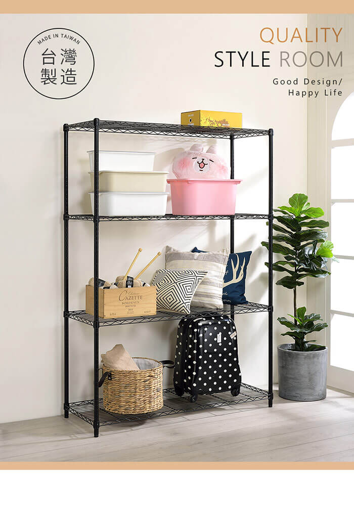 - 主商品尺寸/規格/重量/密度:內容件數:輕型四層烤漆波浪架x1,共1入/組 顏色:尊爵黑 / 浪漫白 材質:鐵管+網片 層數:四層 尺寸:寬120cm x 深45cm x 高150cm 每層高度:依個人收納空間,可任意調整 靜態荷重:單層80KG 內含:鐵管+網片、ABS塑膠材片 重量:13.2KG ±5% (不含包裝) 產地:100%台灣製造