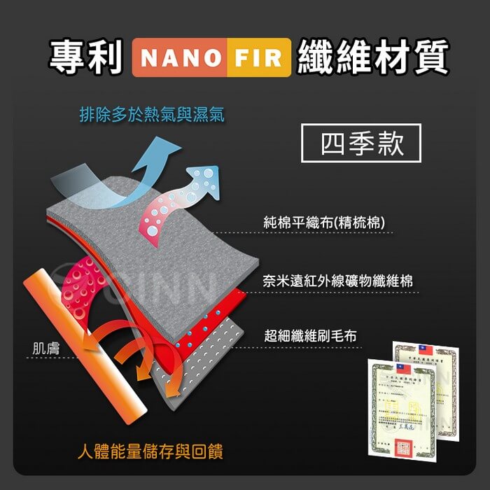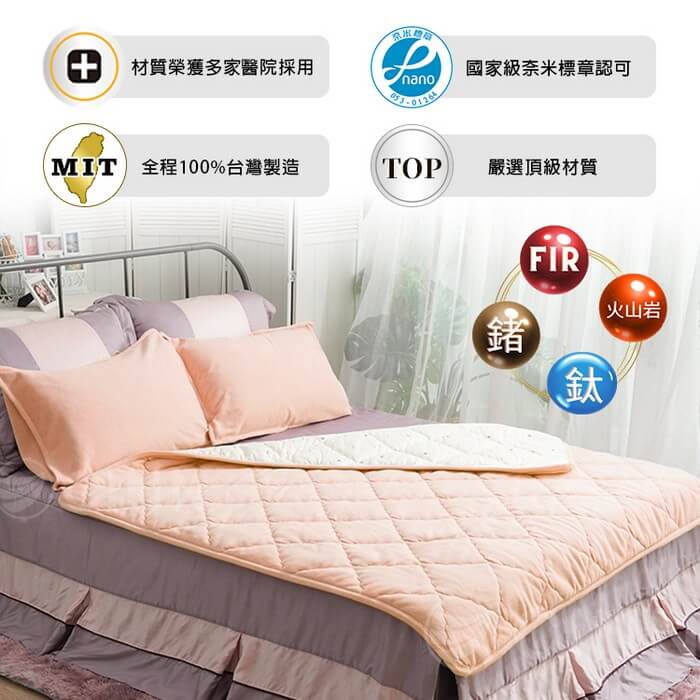 - 材質/食材:表布-100%聚酯纖維(奈米遠紅外線刷毛布) 夾層-100%聚酯纖維(含奈米遠紅外線、鍺、鈦) 底布-100%棉(精梳棉)