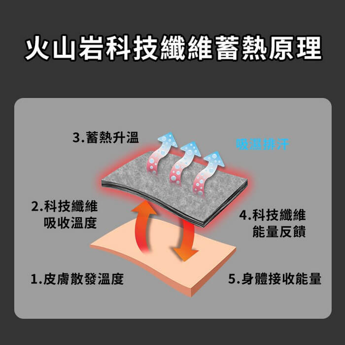 將「高效能遠紅外線」及「火山岩」奈米化後融合鑲嵌在纖維中。
