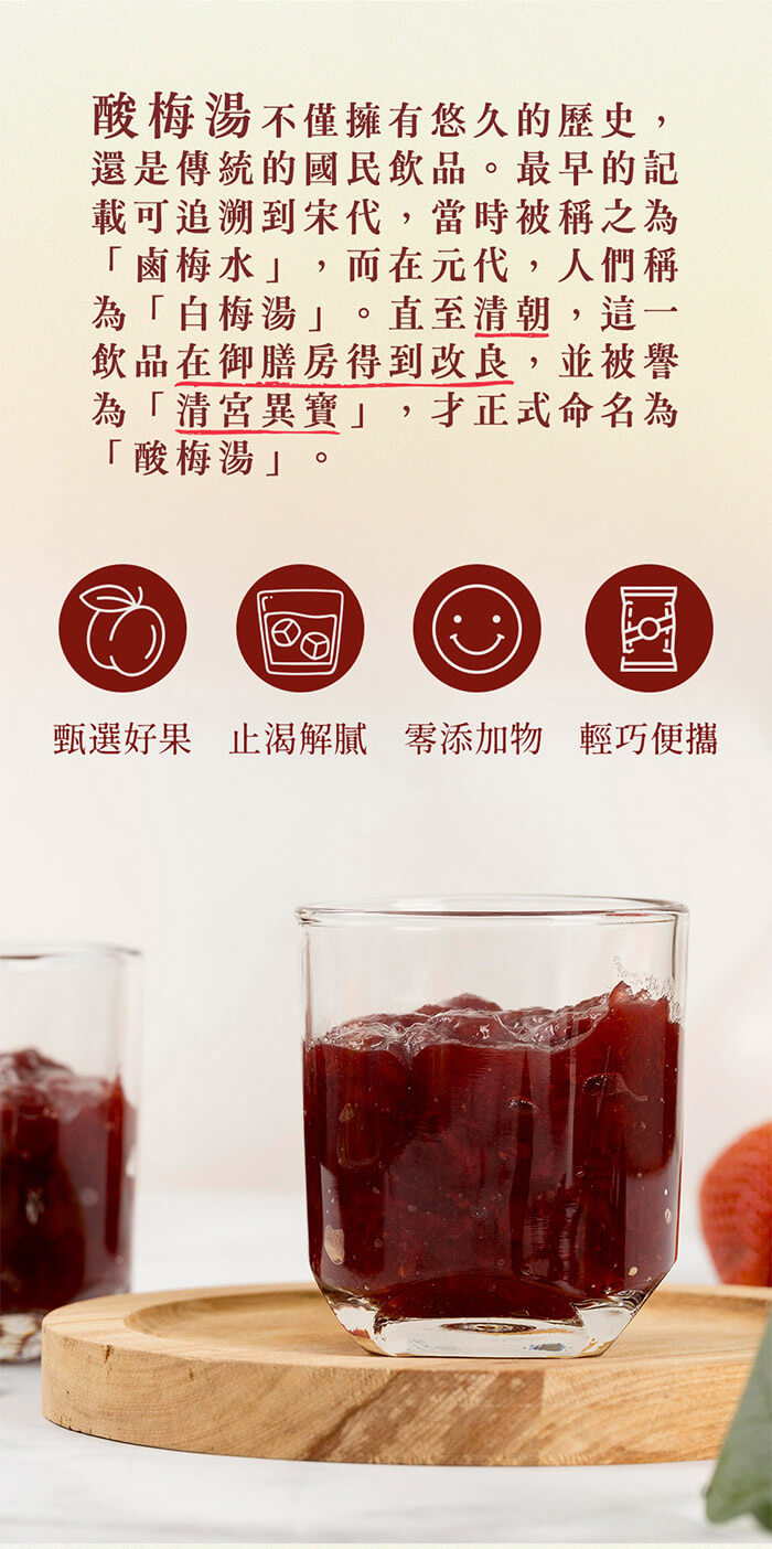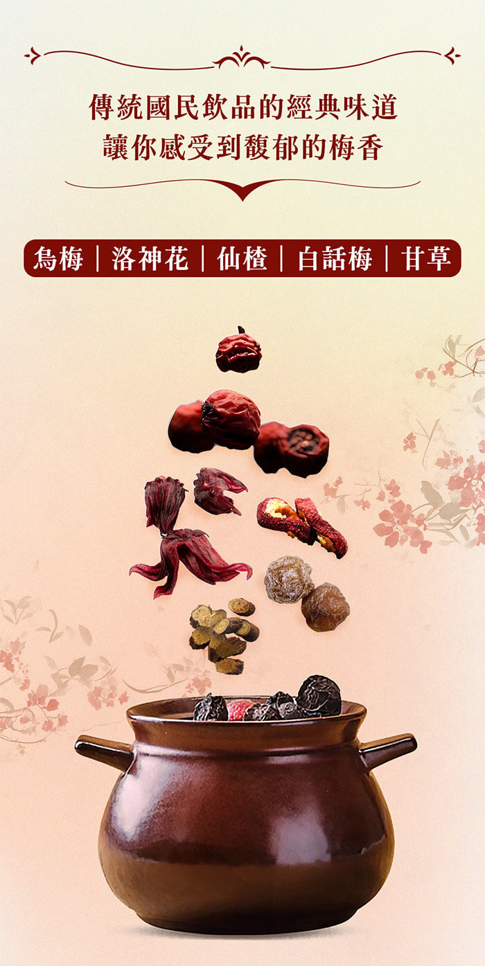 - 材質/食材:內容物成分(如含有豬、牛成分請加註國別):烏梅、洛神花、仙楂、白話梅、甘草、冰糖