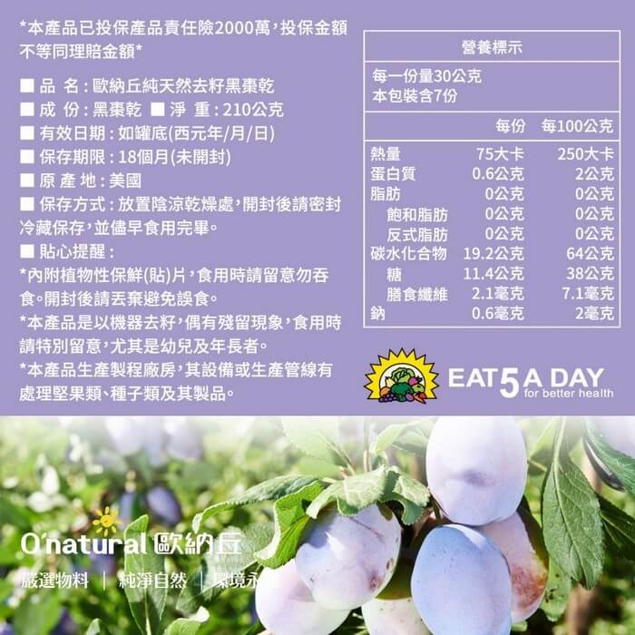 - 主商品:【Onatural 歐納丘 】 純天然去籽黑棗乾(210g/罐)3罐組*1件