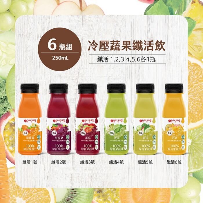 - 材質/食材:(1) 纖活1號-胡蘿蔔冷壓蔬果纖活飲 成分:胡蘿蔔、蘋果、鳳梨、南瓜、芹菜、檸檬 (2) 纖活2號-紅龍果冷壓蔬果纖活飲 成分:蘋果、紅龍果、胡蘿蔔、檸檬、紫甘藍 (3) 纖活3號-蕃茄冷壓蔬果纖活飲 成分:甘蔗、葡萄、蘋果、番茄、甜菜根、胡蘿蔔、檸檬 (4) 纖活4號-菠菜冷壓蔬果纖活飲 成分:芭樂、葡萄、甘蔗、蘋果、波菜、檸檬 (5) 纖活5號-黃瓜冷壓蔬果纖活飲 成分:鳳梨、蘋果、黃瓜、芥藍 (6) 纖活6號-芒果冷壓蔬果纖活飲 成分:蘋果、芒果、黃金奇異果、香蕉、南瓜、甜椒