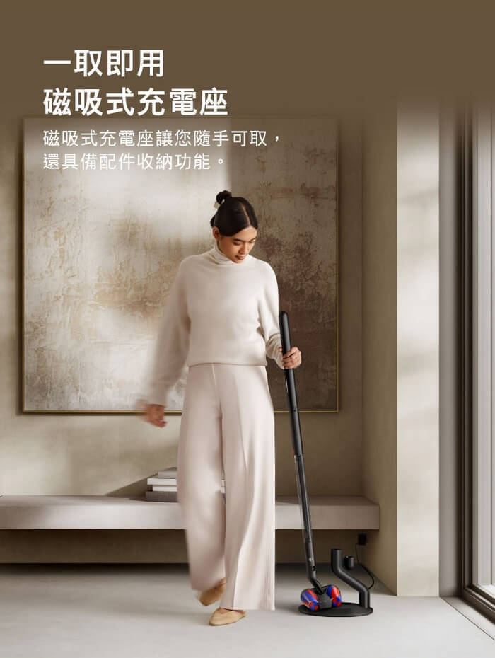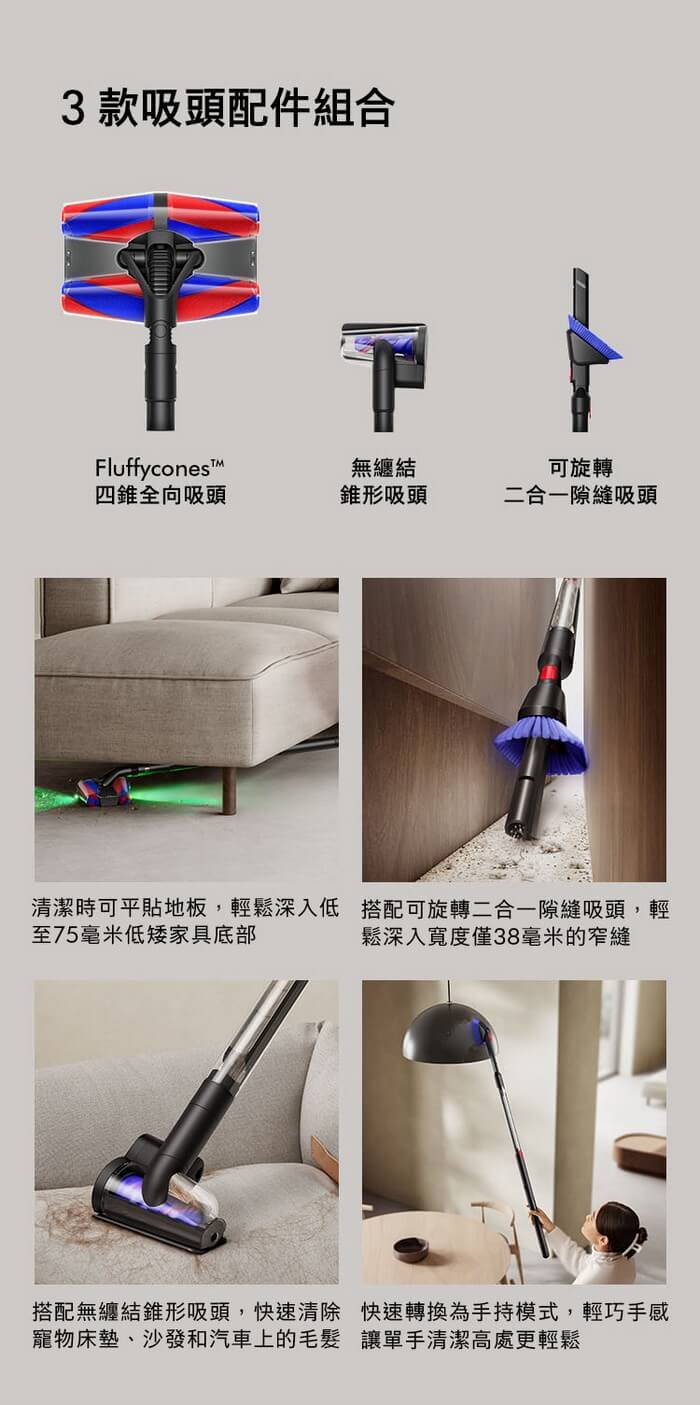 - 配件:四錐全向吸頭×1、可旋轉二合一隙縫吸頭×1、無纏結錐型吸頭×1、磁吸式充電座×1、充電器×1
