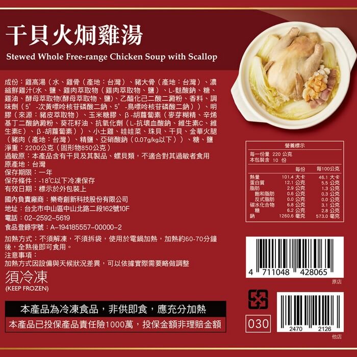 - 主商品尺寸/規格/重量:品名:【台南遠東香格里拉飯店】干貝火烔雞湯-2200g(固形物850g) 內容物名稱:【台南遠東香格里拉飯店】干貝火烔雞湯-2200g(固形物850g) 內容量:2200g(固形物850g)/盒 原產地:台灣 保存期限:冷凍 12個月 製造廠商或國內負責廠商名稱: 樂奇創新科技股份有限公司 製造廠商或國內負責廠商電話:02-2592-5619 製造廠商或國內負責廠商地址: 104027 台北市中山區中山北路二段162號10樓 投保產品責任險字號:明台產物保險:0803-14PDT00874號 食品業者登錄字號:A-194185557-00000-2