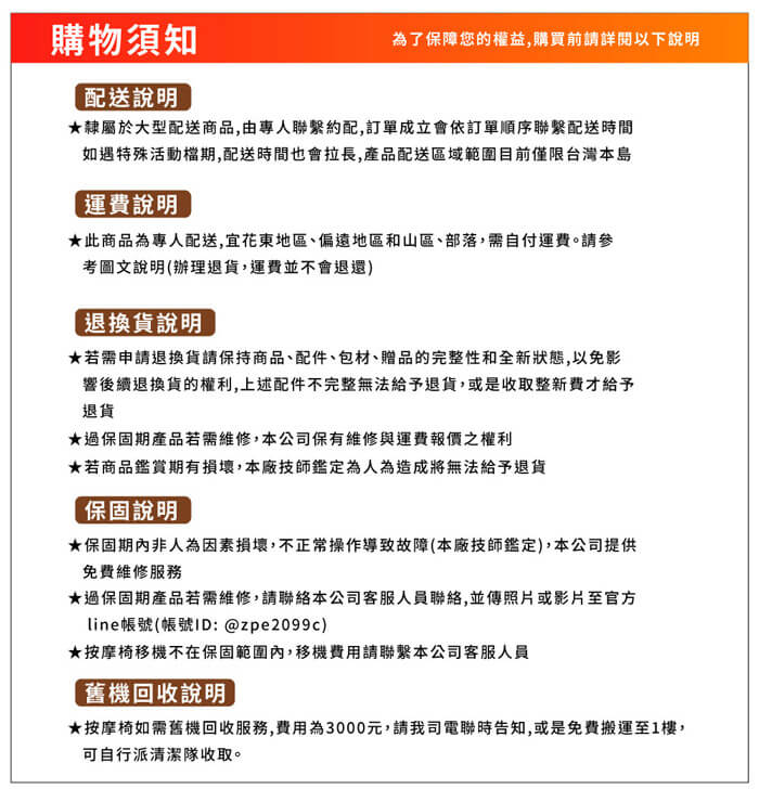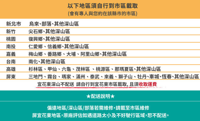 ◎針對大型商品(如大型家電、家具床墊、健身按摩器材、車類…等),因商品屬性關係,我們將於完成收款確認後,三個工作日內由專人與您確認送貨時間(可約定到貨日為下單日起90天內)及配送細節等。