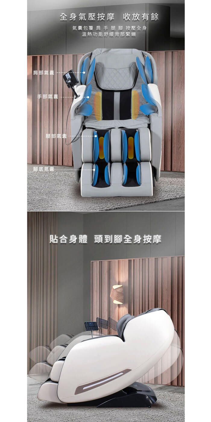 全身氣壓按摩,背部溫熱功能,六段定時設定。