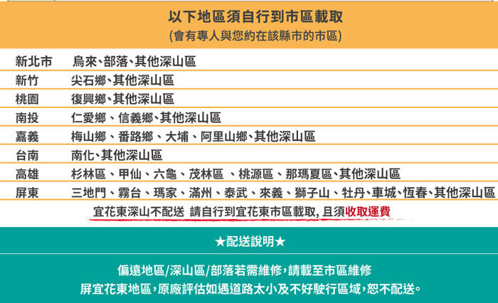 ◎針對大型商品(如大型家電、家具床墊、健身按摩器材、車類…等),因商品屬性關係,我們將於完成收款確認後,三個工作日內由專人與您確認送貨時間(可約定到貨日為下單日起90天內)及配送細節等。