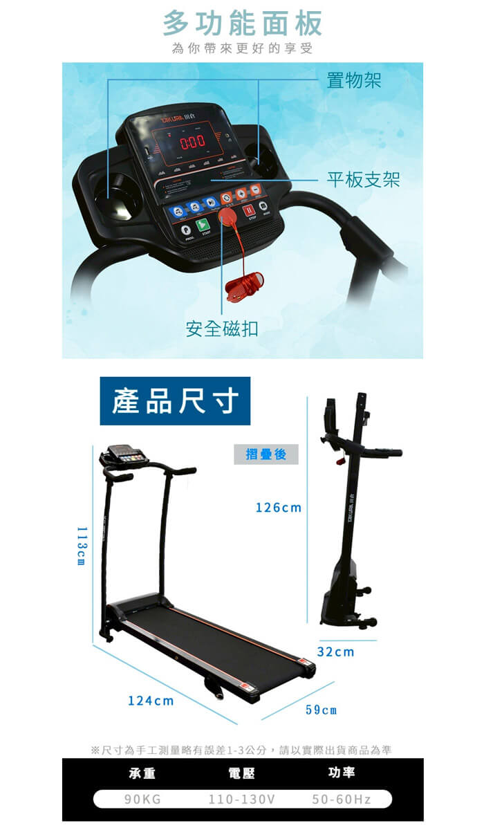 - 主商品尺寸/規格/重量/密度:尺寸:124*56*120cm 淨重:24kg 可承載重量:90kg 電源電壓:110V/60Hz