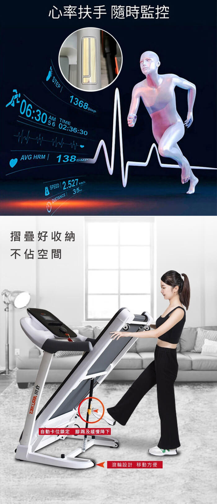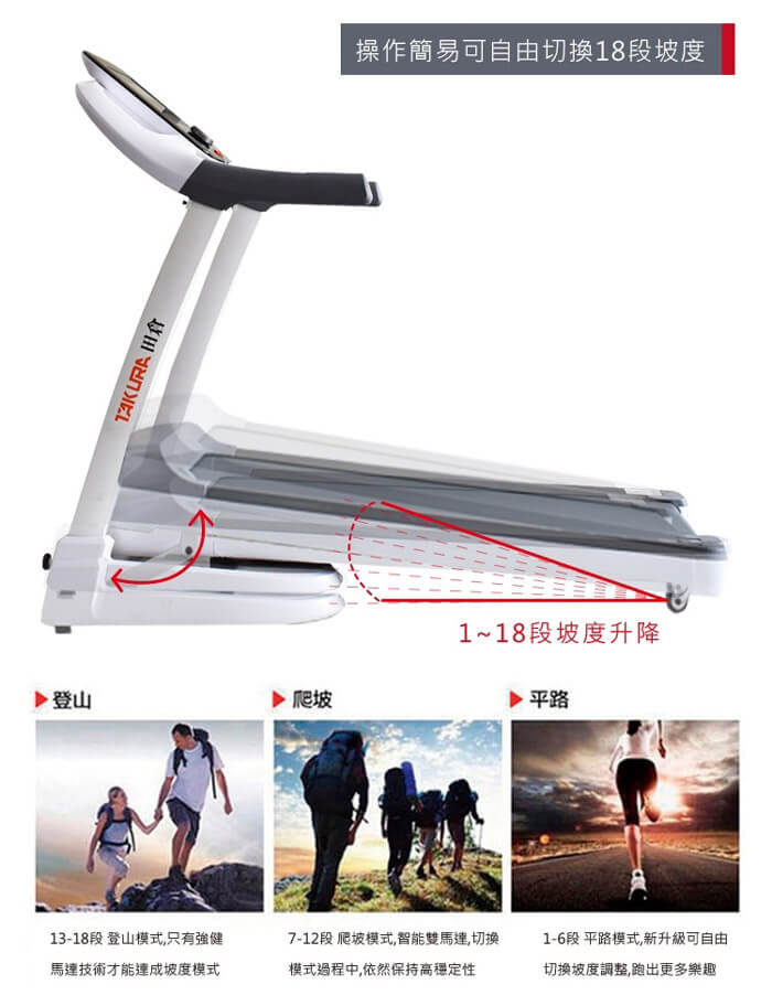 45cm摺疊跑帶,耐滑耐磨,18段坡度調整。