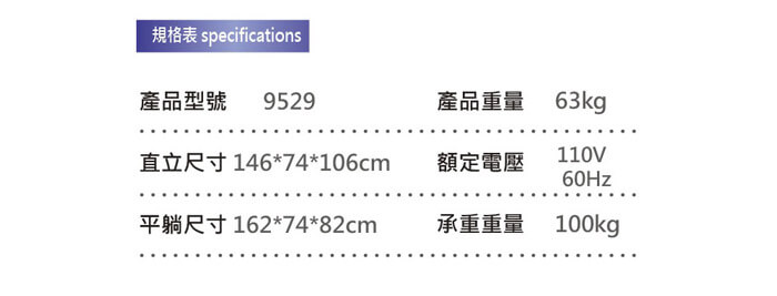 - 主商品尺寸/規格/重量/密度:直立 146*74*106公分 躺臥 162*74*82 公分 淨重:63kg 電源電壓:110V/60Hz