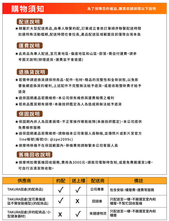 ◎針對大型商品(如大型家電、家具床墊、健身按摩器材、車類…等),因商品屬性關係,我們將於完成收款確認後,三個工作日內由專人與您確認送貨時間(可約定到貨日為下單日起90天內)及配送細節等。