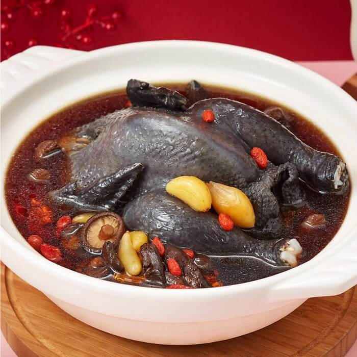- 材質/食材:水、烏骨雞、香菇、黑蒜頭、蒜頭、枸杞、糖、 L-麩酸鈉、老抽(糖、水、鹽、黃豆(非基因改造)、麵粉、普通焦糖色素)。