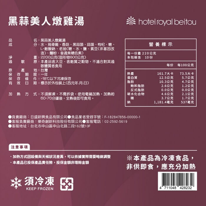 - 主商品尺寸/規格/重量:品名:【北投老爺酒店】黑蒜美人燉雞湯-2200g(固形物800g) 內容物名稱:【北投老爺酒店】黑蒜美人燉雞湯-2200g(固形物800g) 內容量:2200g(固形物800g)/盒 原產地:台灣 保存期限:冷凍 12個月 製造廠商或國內負責廠商名稱: 樂奇創新科技股份有限公司 製造廠商或國內負責廠商電話:02-2592-5619 製造廠商或國內負責廠商地址: 104027 台北市中山區中山北路二段162號10樓 投保產品責任險字號:明台產物保險:0803-14PDT00874號 食品業者登錄字號:A-194185557-00000-2