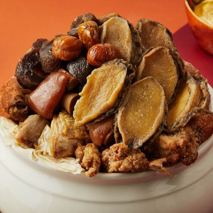 - 材質/食材:高湯(水、雞汁(水、鹽、雞肉萃取物 (雞肉萃取物、鹽) 、L-麩酸鈉、糖、雞油、酵母萃取物(酵母萃取物、鹽)、乙醯化己二酸二澱粉、香料、調味劑(5'-次黃嘌呤核苷磷酸二鈉、5'-鳥嘌呤核苷磷酸二鈉)、明膠、玉米糖膠、β-胡蘿蔔素(麥芽糊精、辛烯基丁二酸鈉澱粉、葵花籽油、抗氧化劑(L-抗壞血酸鈉、維生素C、維生素E)、β-胡蘿蔔素))、蠔油(蠔汁(蠔、水、鹽)、糖、水、調味劑(L-麩酸鈉)、鹽、粘稠劑(羥丙基磷酸二澱粉)、小麥粉、著色劑(焦糖色素))、紅露酒、雞肉(產地:台灣)、鮑魚、烏參、栗子、豬肚(產地:台灣)、鳥蛋、豬腳丁(產地:台灣)、筍片、蔥、蒜頭。