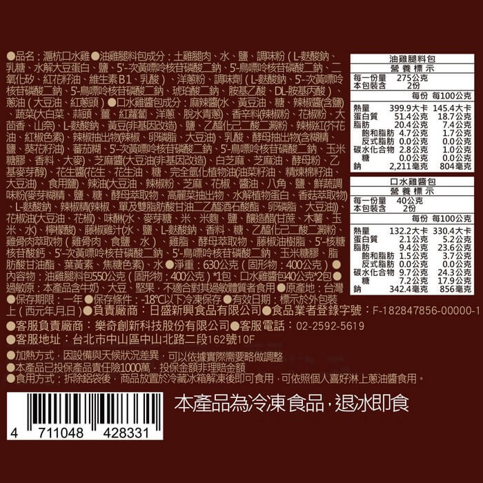 - 材質/食材:油雞腿料包成分:土雞腿肉、水、鹽、調味粉(L-麩酸鈉、乳糖、水解大豆蛋白、鹽、5'-次黃嘌呤核苷磷酸二鈉、5'-鳥嘌呤核苷磷酸二鈉、二氧化矽、紅花籽油、維生素B1、乳酸)、洋蔥粉、調味劑(L-麩酸鈉、5'-次黃嘌呤核苷磷酸二鈉、5'-鳥嘌呤核苷磷酸二鈉、琥珀酸二鈉、胺基乙酸、DL-胺基丙酸)、蔥油(大豆油、紅蔥頭)。 口水雞醬包成分:麻辣醬(水、黃豆油、糖、辣椒醬(含鹽)、蔬菜(大白菜、蒜頭、薑、紅蘿蔔、洋蔥、脫水青蔥)、香辛料(辣椒粉、花椒粉、大茴香、山奈)、L-麩酸鈉、黃豆(非基因改造)、鹽、乙醯化己二酸二澱粉、辣椒紅(芥花油、紅椒色素)、辣椒抽出物(辣椒、卵磷脂、大豆油)、乳酸、酵母抽出物(含糊精、鹽、葵花籽油)、蕃茄糊、5‘-次黃嘌呤核苷磷酸二鈉、5‘-鳥嘌呤核苷磷酸二鈉、玉米糖膠、香料、大麥)、芝麻醬(大豆油(非基因改造)、白芝麻、芝麻油、酵母粉、乙基麥芽醇)、花生醬(花生、花生油、糖、完全氫化植物油(油菜籽油、精煉棉籽油、大豆油)、食用鹽)、辣油(大豆油、辣椒粉、芝麻、花椒、醬油、八角、鹽、鮮蔬調味粉(麥芽糊精、鹽、糖、酵母萃取物、高麗菜抽出物、水解植物蛋白、香菇萃取物)、L-麩酸鈉、辣椒精(辣椒、單及雙脂肪酸甘油二乙醯酒石酸酯、卵磷脂、大豆油))、花椒油(大豆油、花椒)、味醂(水、麥芽糖、米、米麴、鹽、釀造醋(甘蔗、木薯、玉米、水)、檸檬酸)、藤椒雞汁(水、鹽、L-麩酸鈉、香料、糖、乙醯化己二酸二澱粉、雞骨肉萃取物(雞骨肉、食鹽、水)、雞脂、酵母萃取物、藤椒油樹脂、5’-核糖核苷酸鈣、5’-次黃嘌呤核苷磷酸二鈉、5’-鳥嘌呤核苷磷酸二鈉、玉米糖膠、脂肪酸甘油酯、葉黃素、焦糖色素)、水。