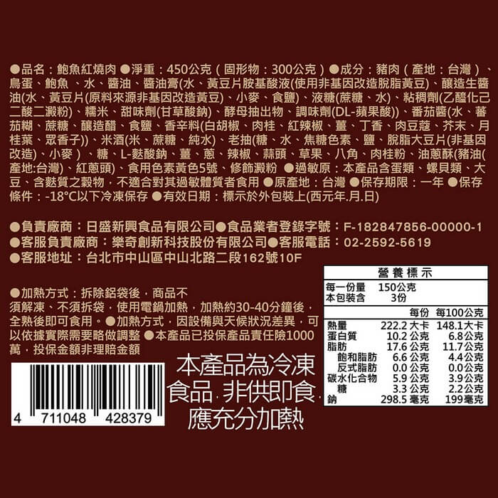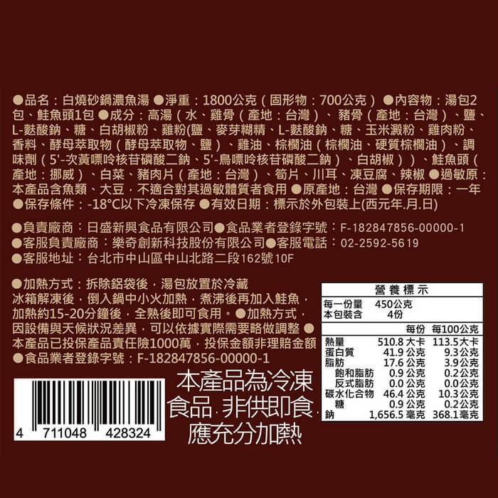 - 主商品尺寸/規格/重量:品名:【上海鄉村】年菜6件組(魚湯+燒雞飯+口水雞+無錫燒子排+東坡肉+鮑魚紅燒肉) 內容物名稱:(魚湯+燒雞飯+口水雞+無錫燒子排+東坡肉+鮑魚紅燒肉)/各一袋 內容量:下列各一袋: 【上海鄉村】白燒砂鍋濃魚湯-1800g(固形物700g) 【上海鄉村】滬杭口水雞-630g(固形物400g) 【上海鄉村】栗子燒雞飯-1000g 【上海鄉村】本幫東坡肉-600g(固形物400g) 【上海鄉村】本幫鮑魚紅燒肉-450g(固形物300g) 【上海鄉村】無錫燒子排-500g(固形物330g) 原產地:台灣 保存期限:冷凍 12個月 製造廠商或國內負責廠商名稱: 樂奇創新科技股份有限公司 製造廠商或國內負責廠商電話:02-2592-5619 製造廠商或國內負責廠商地址: 104027 台北市中山區中山北路二段162號10樓 投保產品責任險字號:明台產物保險:0803-14PDT00874號 食品業者登錄字號:A-194185557-00000-2