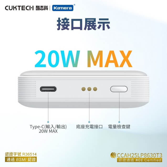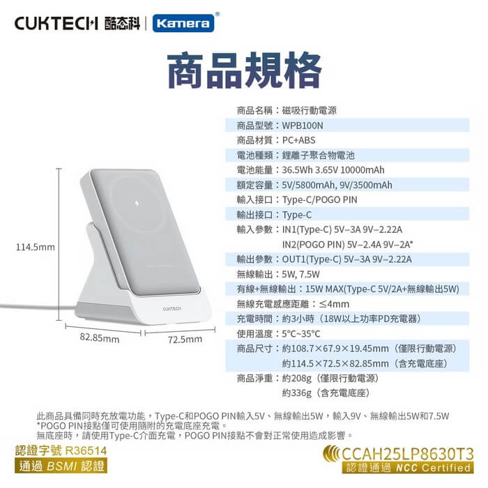 - 主商品尺寸/規格/重量/密度:商品品名:磁吸行動電源 商品型號:WPB100N 商品材質:PC+ABS 商品顏色:灰色 電池種類:鋰離子聚合物電池 電池能量:36.5Wh 3.65V 10000mAh 額定容量:5V/5800mAh, 9V/3500mAh 輸入接口:Type-C/POGO PIN 輸出接口:Type-C 輸入參數:IN1(Type-C) 5V⎓3A 9V⎓2.22A IN2(POGO PIN) 5V⎓2.4A 9V⎓2A* 輸出參數:OUT1(Type-C) 5V⎓3A 9V⎓2.22A 無線輸出:5W, 7.5W 有線+無線輸出:15W MAX(Type-C 5V/2A+無線輸出5W) 無線充電感應距離:≤4mm 充電時間:約3小時(18W以上功率PD充電器) 使用溫度:5℃~35℃ 此商品具備同時充放電功能,Type-C和POGO PIN輸入5V、無線輸出5W,輸入9V、無線輸出5W和7.5W *POGO PIN接點僅可使用隨附的充電底座充電。 無底座時,請使用Type-C介面充電,POGO PIN接點不會對正常使用造成影響。 BSMI認證字號:R36514 NCC 認證字號:CCAH25LP8630T3 商品尺寸:約108.7×67.9×19.45mm(僅限行動電源) 約114.5×72.5×82.85mm(含充電底座) 包裝尺寸:約116×96×76mm 商品淨重:約208g(僅限行動電源) 約336g(含充電底座) 商品毛重:約405g 包裝內容:磁吸行動電源×1、充電底座、充電線×1、使用說明書×1 保固:180天/非人為因素造成 備註:此賣場不含主機相關展示商品