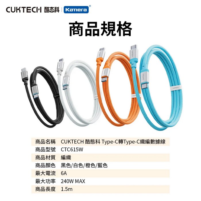 - 主商品尺寸/規格/重量/密度:商品品名:Type-C轉Type-C 240W 織編數據線 6A 商品型號:CTC615W 商品材質:TPE編織 商品顏色:黑色、白色、橙色、藍色 介面類型:Type-C轉Type-C 最大電流:6A MAX 最大功率:240W MAX 商品長度:150cm 包裝尺寸:約120×50×25mm 商品淨重:約70g 商品毛重:約72.5g 包裝內容:織編數據線×1 保固:180天/非人為因素 備註:此賣場不含主機相關展示商品
