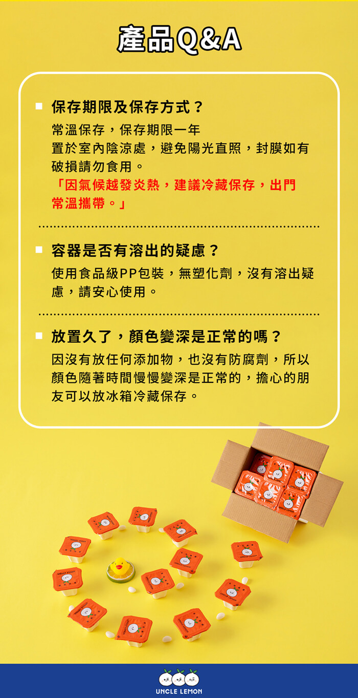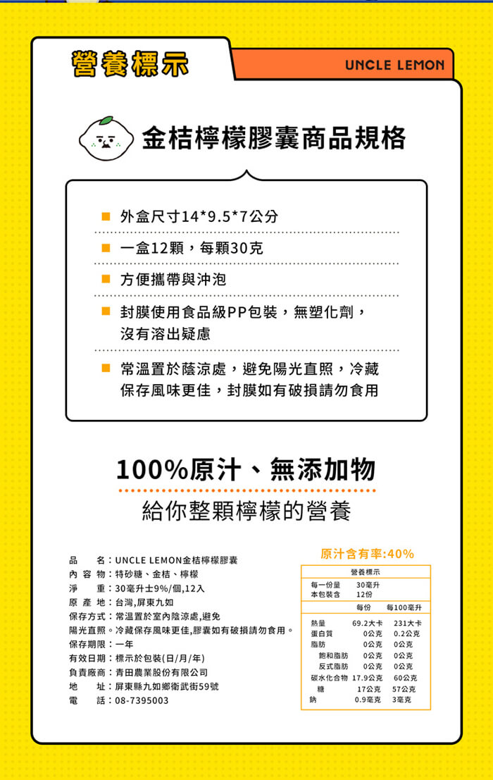- 主商品尺寸/規格/重量:商品名:檸檬大叔金桔檸檬磚(12入/盒) 成分:■ 屏東九如檸檬、金桔、特砂糖 規格:30毫升+9%個,12入/盒 生產廠商名稱:青田農業股份有限公司 廠商電話號碼:08-739-5003 廠商地址:屏東縣九如鄉衛武街59號 保存期限:一年