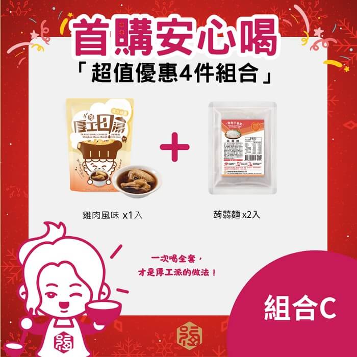 - 主商品:【銀齡福膳】首購安心喝四件組C (漢方雞湯(含肉)X2入+蒟蒻麵2入)