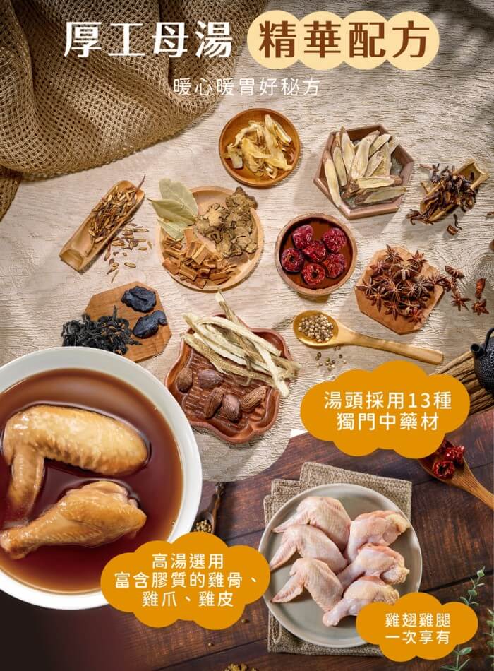 - 材質/食材:成分:水,高湯(由水,本草雞肉,雞骨,雞爪,雞皮,本草豬骨(台灣)及鹽燉煮而成),帶骨雞小腿,雞翅,紅標料理米酒,紹興酒,膳食調理包(桂枝,紅棗,當歸,熟地,黃耆,玉竹,杜仲葉,川芎,肉桂,陳皮,白胡椒,草果,八角茴香),調味料(L-麩酸鈉,鹽,糖,玉米澱粉,乳糖,水解玉米蛋白,麥芽糊精,葵花籽油,香料,香菇粉,棕櫚油)
