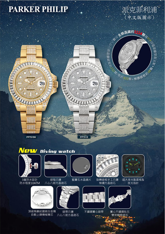 - 錶殼類別:實心不鏽鋼+手工爪鑲八心八箭方晶鋯石約232顆+不鏽鋼旋入式錶冠