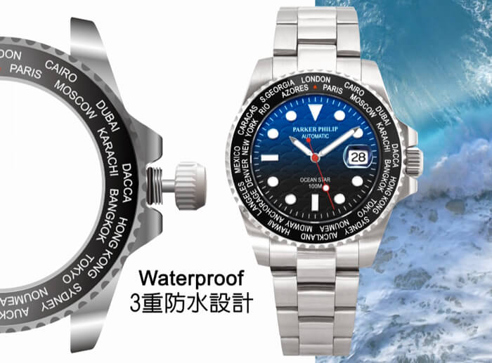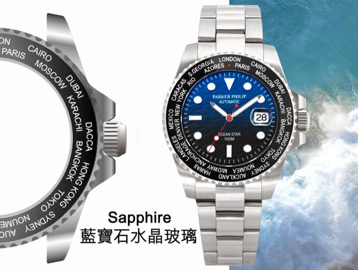 - 鏡面:上/下藍寶石水晶玻璃鏡面+藍寶石放大日期窗(共3片)。