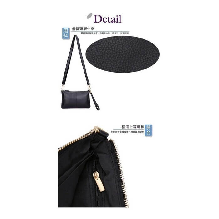- 主商品尺寸/規格/重量:格層功能表(立體平放測量): 尺寸/CM 左右寬24 x上下高14 x 底厚1 材質:牛皮 重量:260g 主夾層 1 外側拉鍊袋 1 內拉鍊袋 1 手機袋 2 配件:附1.可調式活動斜背帶一條 2.可拆式手提把一條