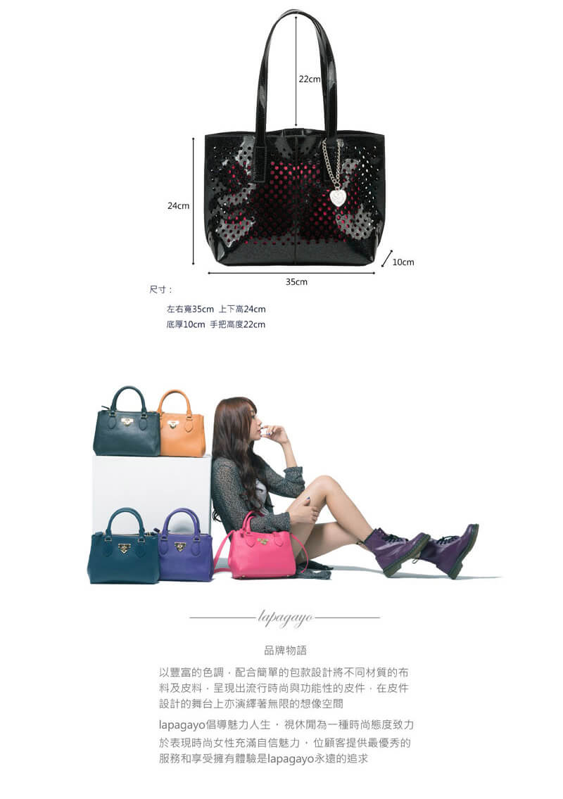- 主商品尺寸/規格/重量:格層功能表(立體平放測量): 左右寬35×上下高24×底厚10cm 手把高度22cm 材質:漆皮 重量:650g 主夾層 1 配件: 細緻lapagayo心型鍊條×1