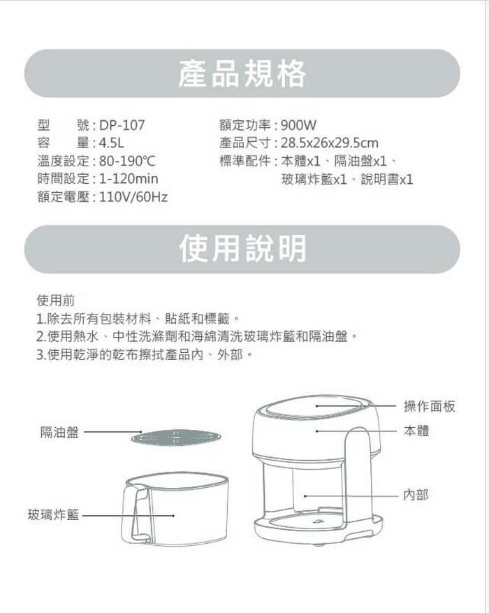 - 主商品:氣炸鍋(含玻璃炸籃)x1(型號:DP-107)