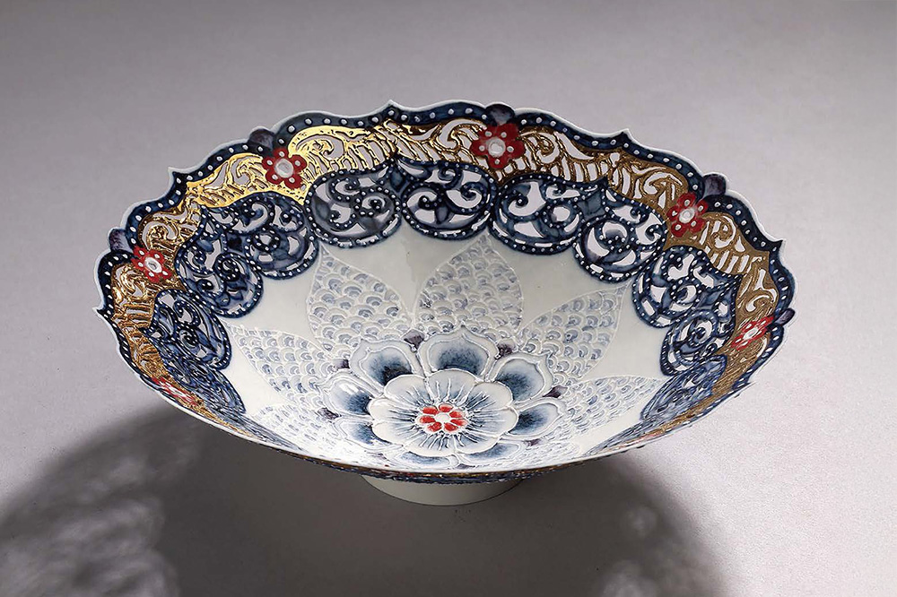 薄胎瓷每件作品重量不超過三兩重,又稱三兩碗,在雙手拉出僅約1.0毫米的胎壁上彩繪、雕琢、上釉,再放於1260℃~1300℃高溫中燒製,每一道工序,皆是功力、耐心與巧思的結合。輕、薄、透、潤,兼具美感與韌性,是作品的特色。