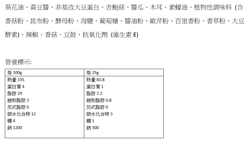 ◆成份:葵花油、黃豆醬、非基改大豆蛋白、杏鮑菇、醬瓜、木耳、素蠔油、植物性調味料 (含香菇粉、昆布粉、酵母粉、海鹽、葡萄糖、醬油粉、歐芹粉、百里香粉、香草粉、大豆酵素)、辣椒、香菇、豆鼓、抗氧化劑 (維生素E)