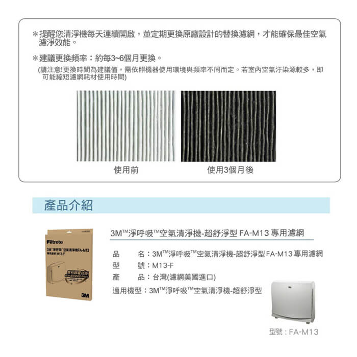 - 主商品尺寸/規格/重量:◆內容物:濾網1片 ◆濾網型號:M13-F ◆適用機型:FA-M13 ◆尺寸:(高*寬*深) 27.9*37.0*2.5 cm ◆重量:308 g ◆國際條碼:4710367427308 ◆產地:台灣 (濾網材質自美國進口) ◆效期:3年