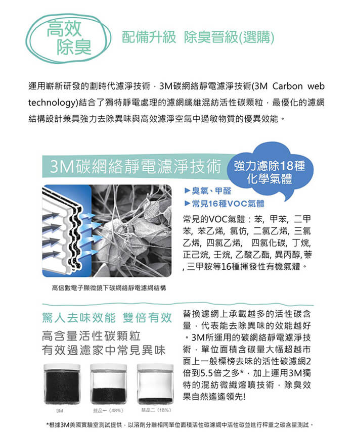 ◆3M碳網絡靜電濾網技術結合了獨特靜電處理的濾網纖維混紡活性碳顆粒,劃時代的濾淨技術結合最優化的濾網結構,強力去味與高效濾淨雙效兼備。