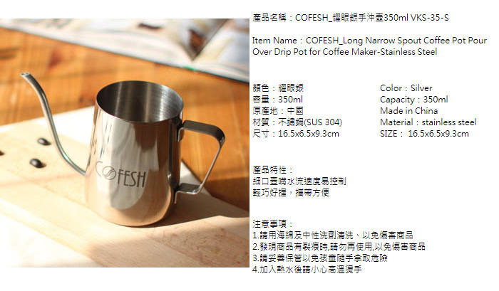 - 主商品:COFESH 耀眼銀手沖壺350ml VKS-35-S