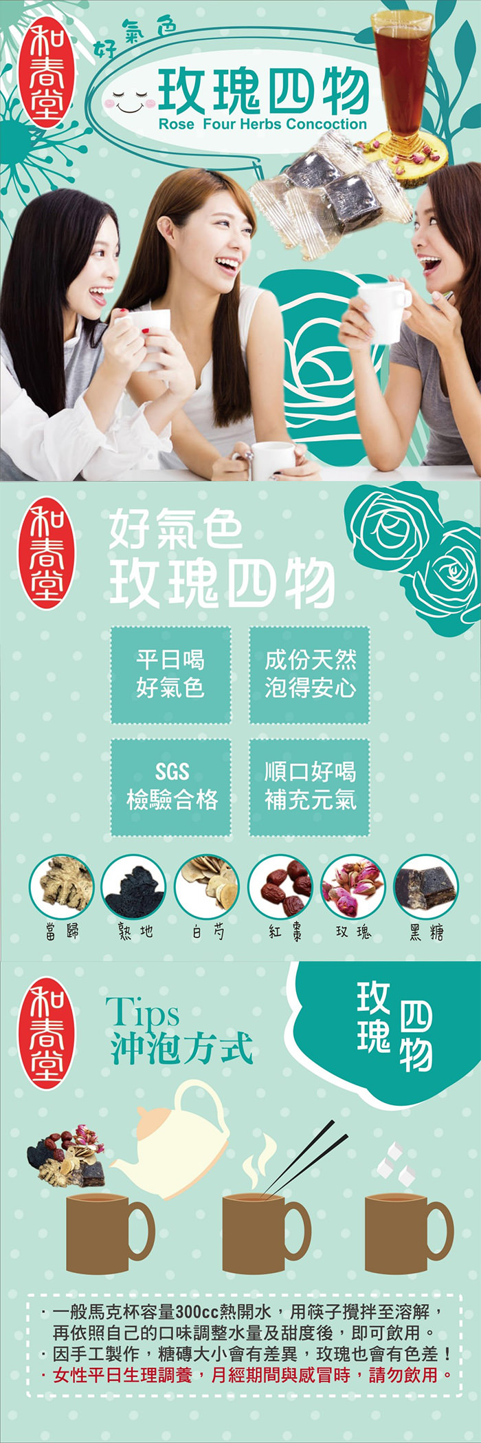- 主商品尺寸/規格/重量:【產品規格】 品名 : 好氣色玫瑰四物飲 成份:黑糖(蔗糖、糖蜜)、水、水飴、紅棗、當歸、熟地、川芎、白芍、檢驗合格玫瑰花瓣 淨重 : 140克(7塊糖磚) 保存期限 : 密封包狀態下12個月 保存方式 : 請置於陰涼處,一經開封後請儘速食用完畢,若長期存放建議可以放冷藏或冷凍 沖泡方式 : 一般馬克杯容量300cc熱開水,用筷子攪拌至溶解後即可飲用。可依照自己的口味調整水量及甜度。 原產地:台灣 【責任廠商】 出品商 : 和春堂中藥房 地址 : 新北市蘆洲區信義路268號 電話 : 02-22831727 食品登錄字號 : T-200024098-00000-1 【注意事項】 ※由於是手工製作,糖磚大小會有些差異,玫瑰也會有些許色差! ※經期間、感冒時請勿飲用