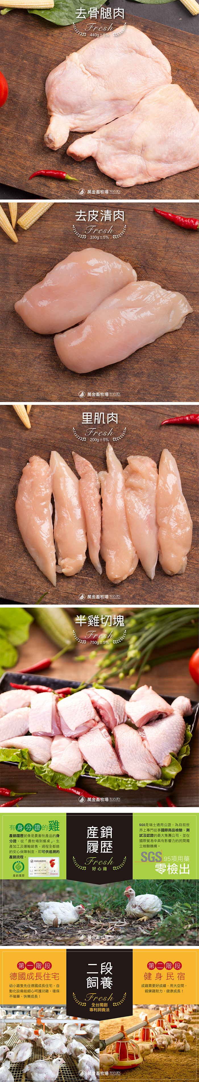 - 主商品:經典組-去骨腿肉(每包2片/440g)*2、清肉(每包2片/330g)*2、里肌肉(每包條數不一,依重量/200g)*2、半雞切塊(750g/包)*2