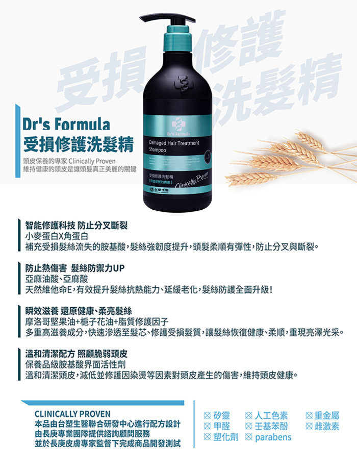 - 主商品:《台塑生醫》Dr’s Formula 受損修護洗髮精580g*3入