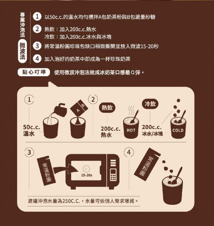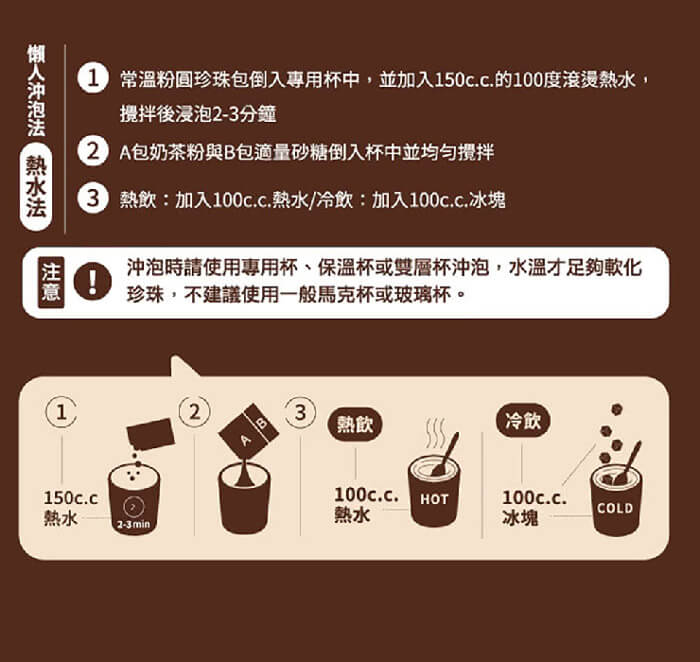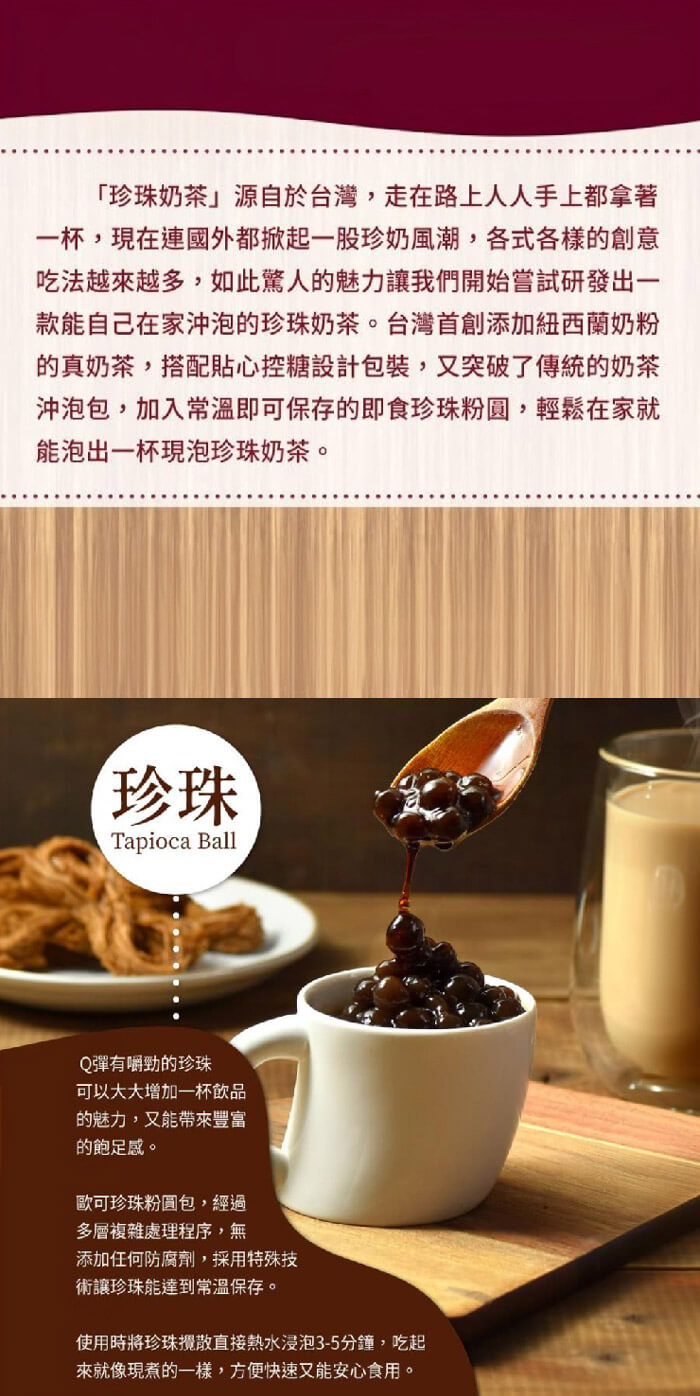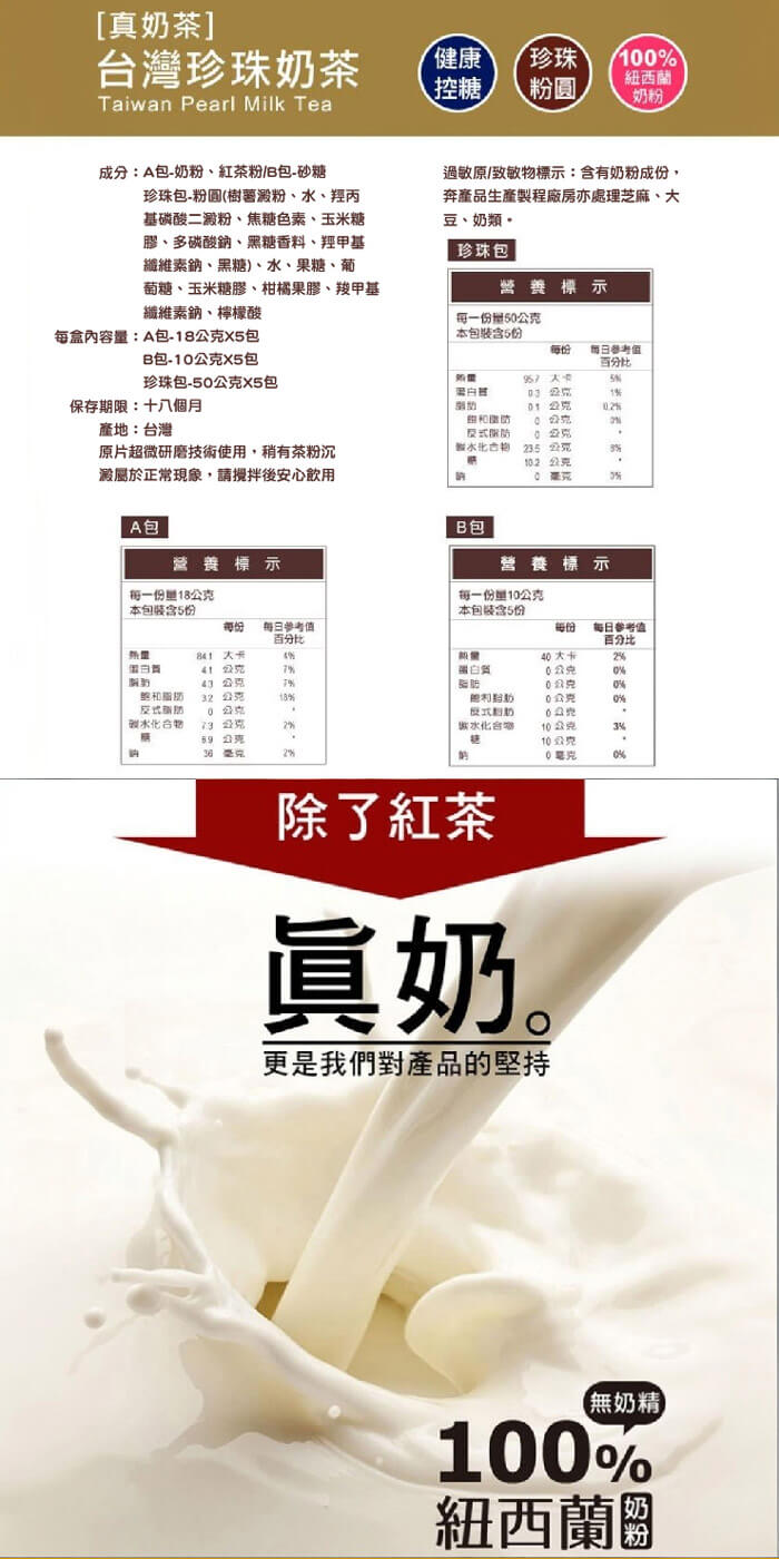 - 材質/食材:成份 A包:奶粉、紅茶粉 B包:砂糖 珍珠包:粉圓(樹薯澱粉、水、羥丙基磷酸二澱粉、焦糖色素、玉米糖膠、多磷酸鈉、黑糖)、水、果糖、葡萄糖、玉米糖膠、柑橘果膠、羧甲基纖維素鈉、檸檬酸