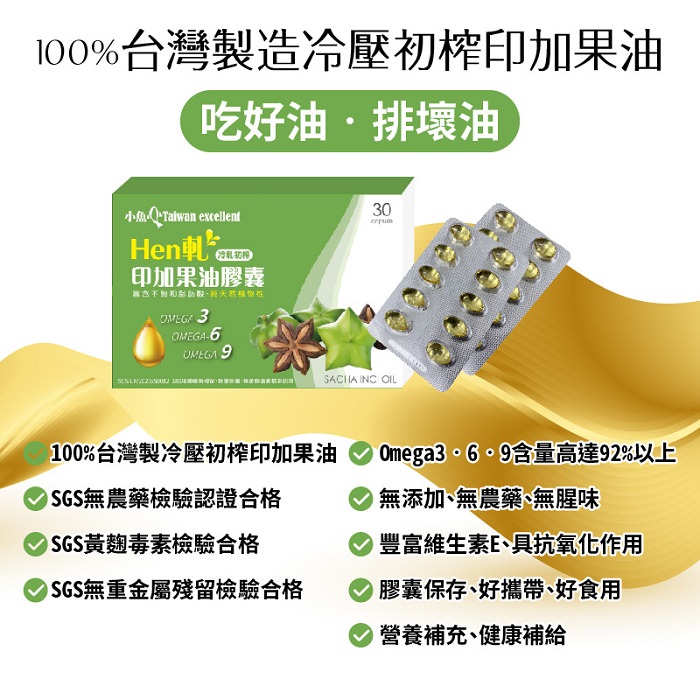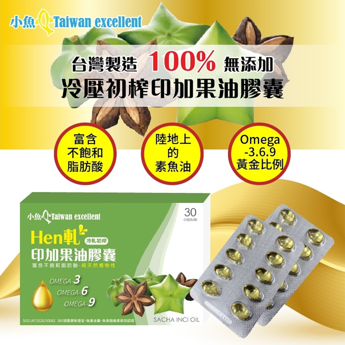 - 主商品尺寸/規格/重量:【產品規格】 品名 : 小魚嚴選HEN軋印加果油膠囊(30盒/粒) 規格:700mg±10%(含膠囊重量)/每粒含印加果油500 mg±10% 成分:印加果油、明膠、甘油、維生素E(抗氧化劑)、純水 食用方法:一天1-2次,每次2粒 保存期限:3年 有效期限 : 標示於包裝上(西元年/月/日) 保存方式 : 請存放於陰涼乾燥處,請勿曝曬於高溫及陽光處 產地:台灣 【營養標示】 每一份量1.4公克(2粒),本包裝含15份 每份:熱量10.6大卡,蛋白質0公克,脂肪1公克(飽和脂肪0.1公克/反式脂肪0公克),碳水化合物0.4公克(糖0公克),鈉2毫克