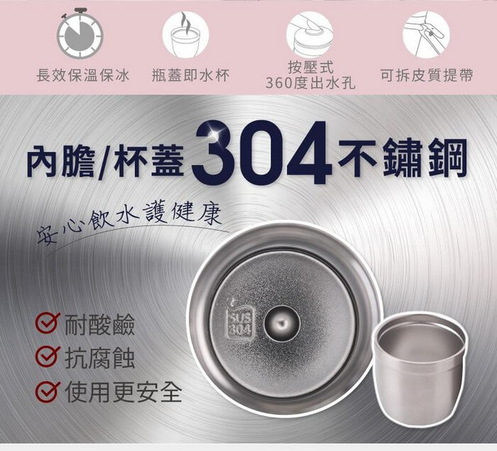 - 材質/食材:材質:內膽、瓶身、杯蓋/304不鏽鋼; 內瓶蓋/304不鏽鋼+PP(聚丙烯,耐熱120℃)