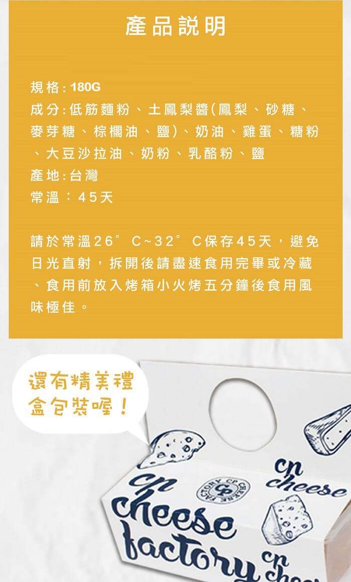 - 主商品尺寸/規格/重量:品 名:一口起司鳳梨酥(小提把禮盒) 成 份:成分:麵粉、鳳梨醬(鳳梨、砂糖、麥芽糖、棕櫚油、鹽)、奶油、雞蛋、糖粉、大豆沙拉油、奶粉、乳酪粉、鹽 淨 重:180公克 (15g x 12入) 保存期限:常溫45天 有效日期:標示於外盒上 廠商名稱:太禓創意行銷有限公司 廠商電話:02-8648-5848 廠商地址:新北市汐止區忠孝東路487-1號1樓 投保產品責任險字號:0527字第20AML0000061號 食品業者登錄字號:F-145917082-00000-9