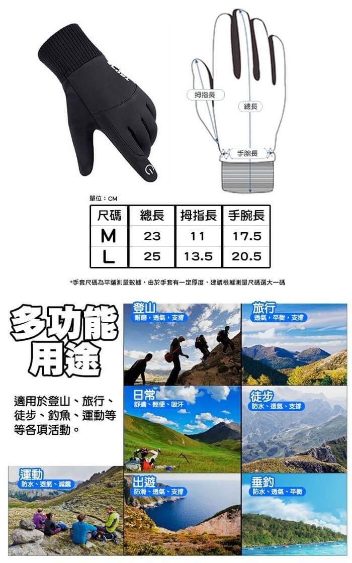 - 主商品尺寸/規格/重量:【產品規格】 商品名稱:防丟防水指尖觸屏內刷毛登山/騎車手套 材質:內刷毛、外防潑水材質 顏色:黑色、灰色 尺寸:M(總長約23CM)、L(總長約25CM) 產地:中國 【退換貨注意事項】 * 鑑賞期非試用期,請先確認好商品,若拆封、下水清洗或穿出門、沾染到非衣服本身的味道、污漬,則無法做退與換貨動作。 * 收到貨請先檢查商品有無問題,超過鑑賞期無法辦理退貨及換貨服務。 * 若商品為人為操作因素使用不當而導致壞損,則無法進行退貨及換貨服務。 * 商品尺寸皆由手工測量,難免會有些誤差哦,依實物為準~ * 開箱商品時建議全程錄影,保障你我權益。